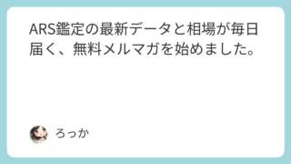 こんにちは、ろっかです。今日はいつもブログを読んでくださっている皆さんに、お知らせがあります。今回、ARS鑑定の最新グレード情報や相場情報が毎日届く、メルマガ(無料)をスタートしました。どんな内容をメルマガで送るのか、なぜ始めたのかなど少し...