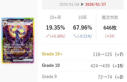 今回は、2026年1月初旬と下旬のグレーディングデータを比較し、グレード取得率や鑑定枚数がどのように変化したのかを調査しました。(シャイニートレジャex~MEGAドリームex)