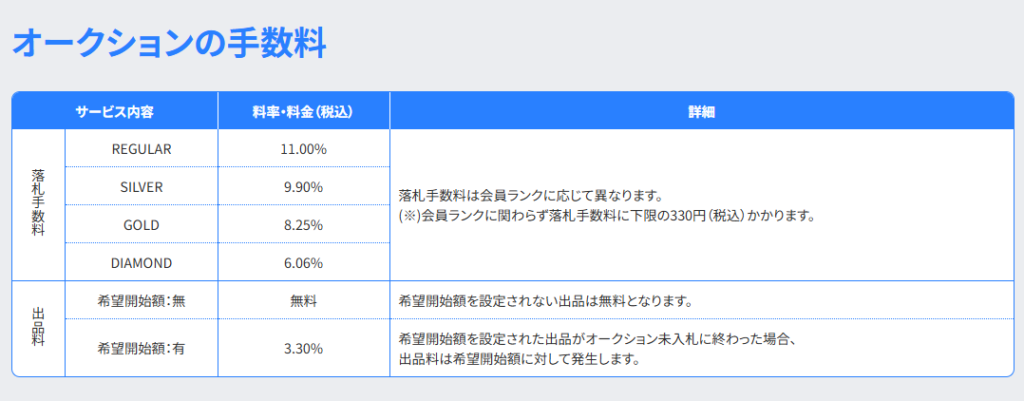 - 買う側もお得な「ランク制度」: 落札手数料(11.00%)は、会員ランク(シルバー~ダイヤモンド)に応じて最大6.05%まで安くなります。